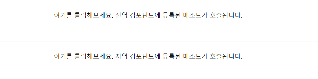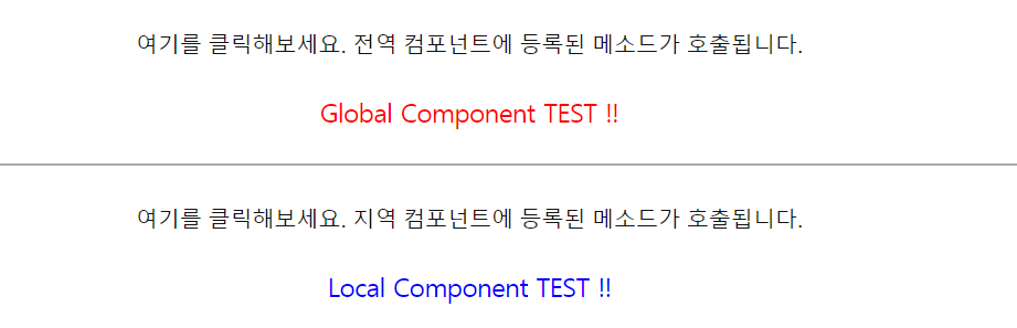 <template> <div> <div> <localComponent /> <GlobalComponent /> </div> </div> </template>지역 컴포넌트와 전역 컴포넌트를 호출하였지만