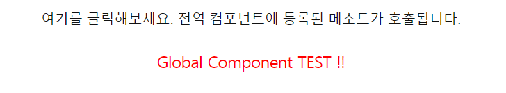 /** 사용할 컴포넌트 파일 Import */ import GloablComponent from '@components/kim/GlobalComponent' /** Vue 생성자에 component 선언 */ Vue.component('GlobalComponent', GloablComponent)3) view 파일에서 등록한 전역 컴포넌트 호출 (TestVueComponent.vue)