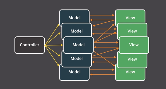 뷰와 모델이 양방향 통신이 가능하므로 하나의 뷰가 모듈을 변경했을 때, 다시 그 모듈이 연관된 뷰들을 갱신하고, 업데이트 된 뷰들이 연관된 모델을 다시 갱신하고, 엮이고 엮이는 관계를 추적하기가 힘듭니다.