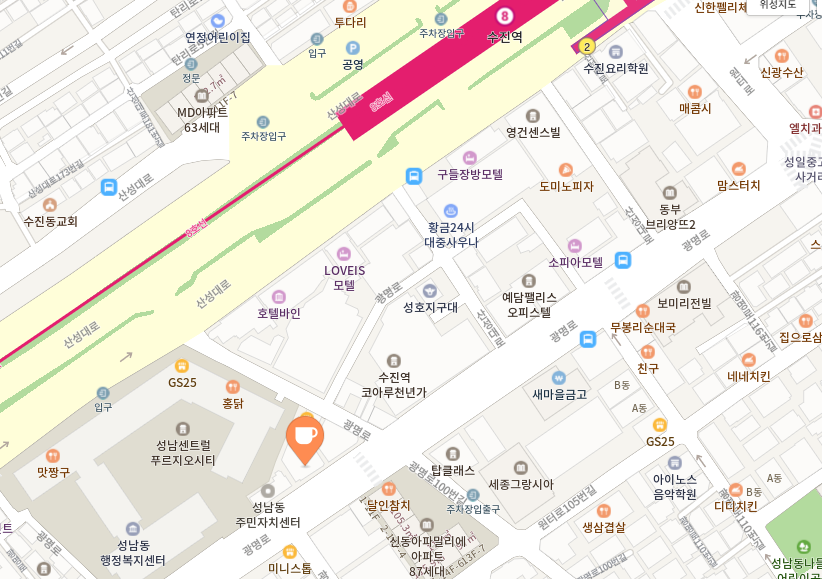 핸즈업 카페는 수진역에서 2번 출구에서 나와서 걸어가면 5분내로 도착하는 곳에 위치하고 있습니다.