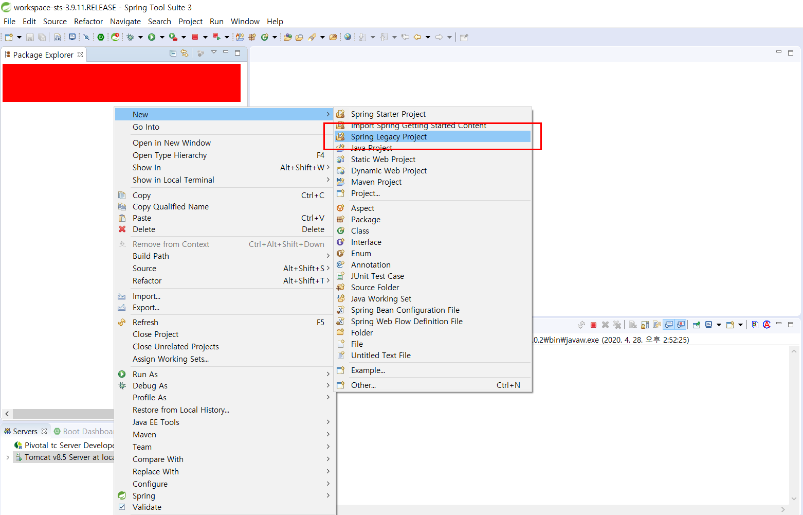 'Package Explorer' 탭 빈 공간에서 우클릭하여 아래 그림 같이 [New > Spring Legacy Project]를 선택합니다.