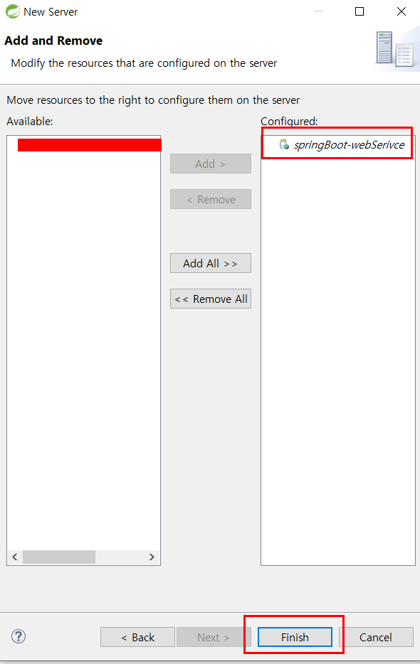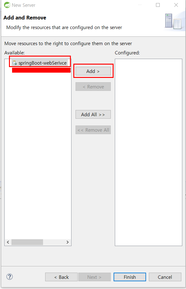 서버가 구동할 프로젝트를 선택해서 'Add'를 클릭합니다.