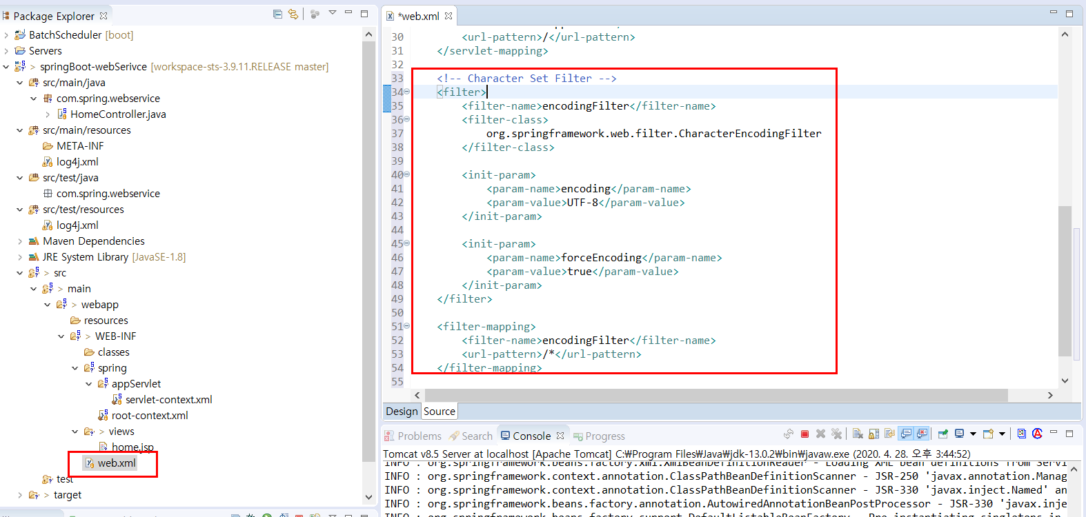 언어 셋팅을 하지 않아 글자가 깨지는 것이므로, 언어 셋팅을 하기 위해 web.xml 파일을 편집합니다.