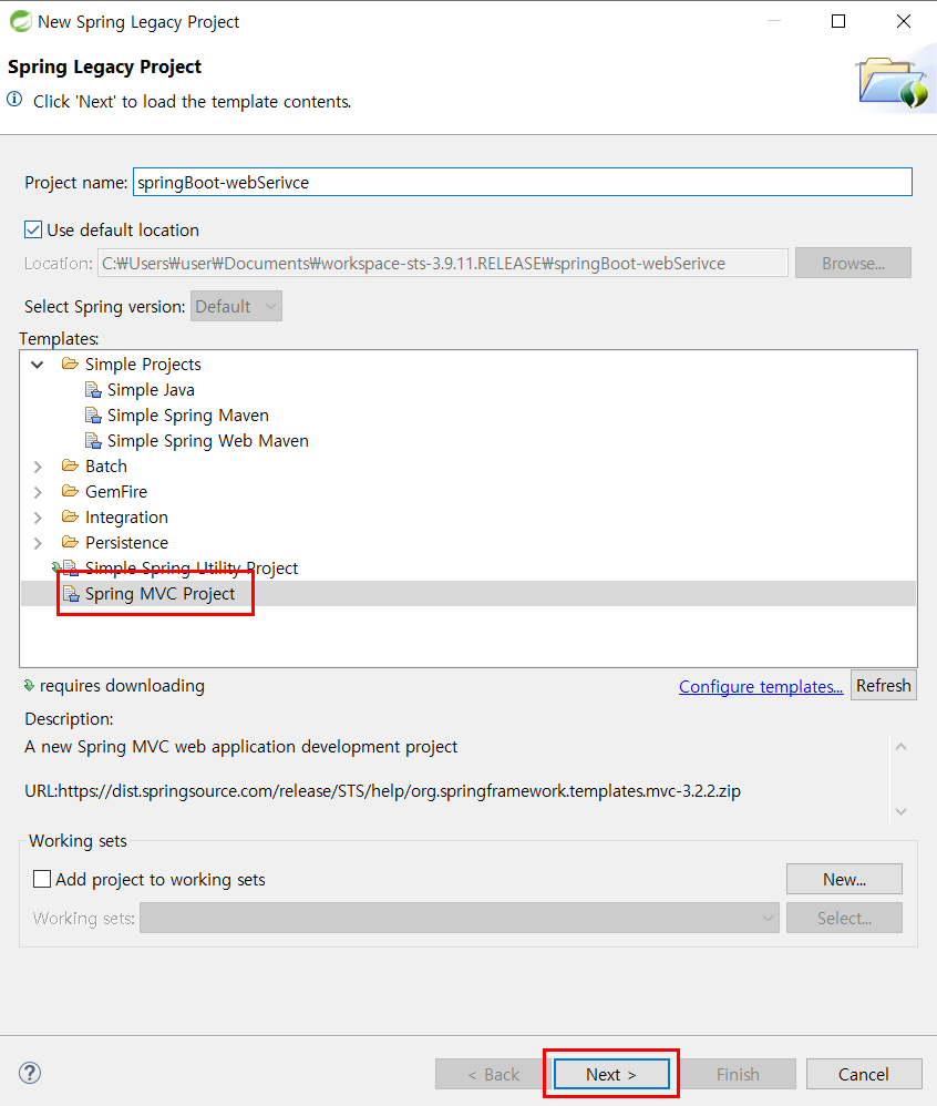 'New Spring Legacy Project' 창에서 아래쪽에 있는 [Spring MVC Project]를 선택 후에 'Next' 클릭 !
