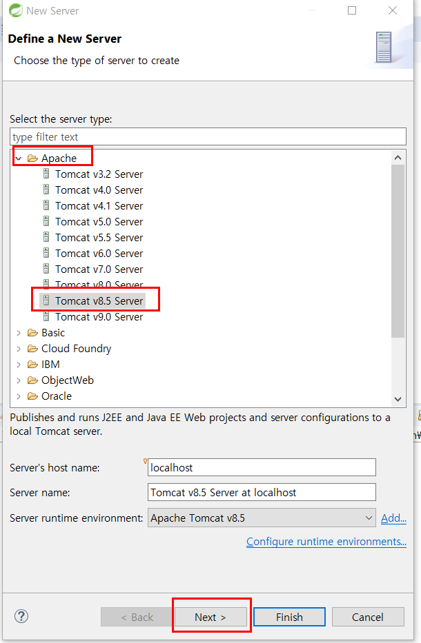 'Apache'를 선택하고 'Tomcat v8.5 Server'을 선택 하고 'Next' 클릭 !