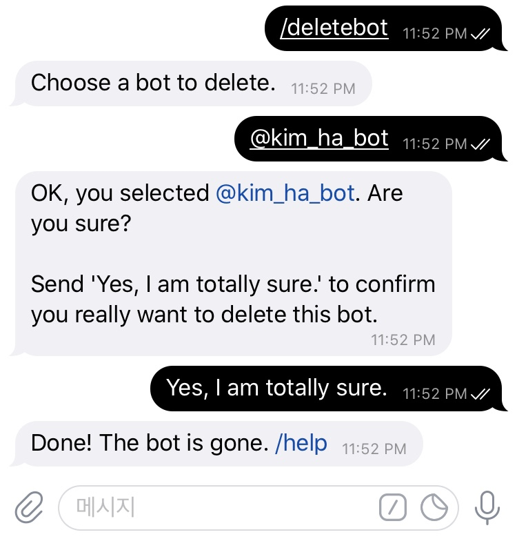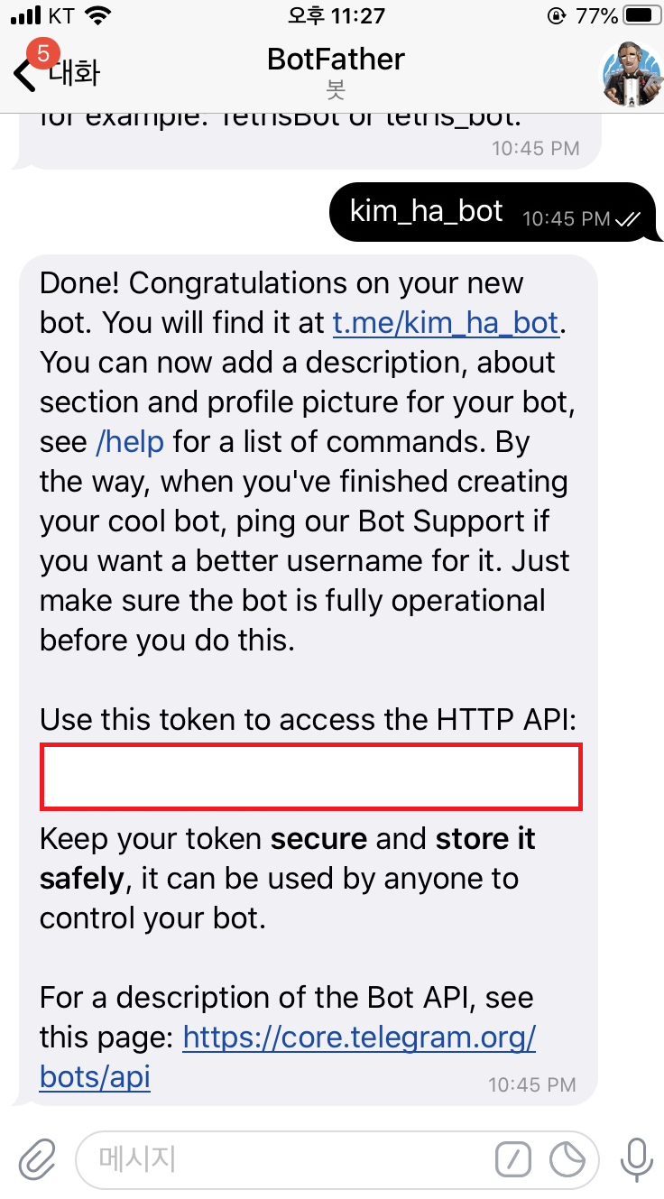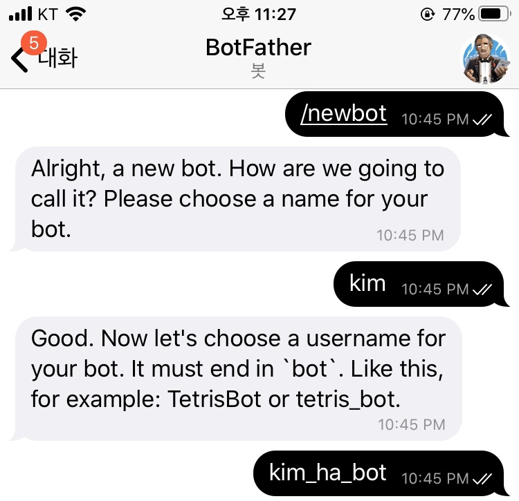 그리고, username은 마지막 끝에 '_bot' 또는 'bot'을 붙혀 bot으로 끝나게 만들어야 합니다.