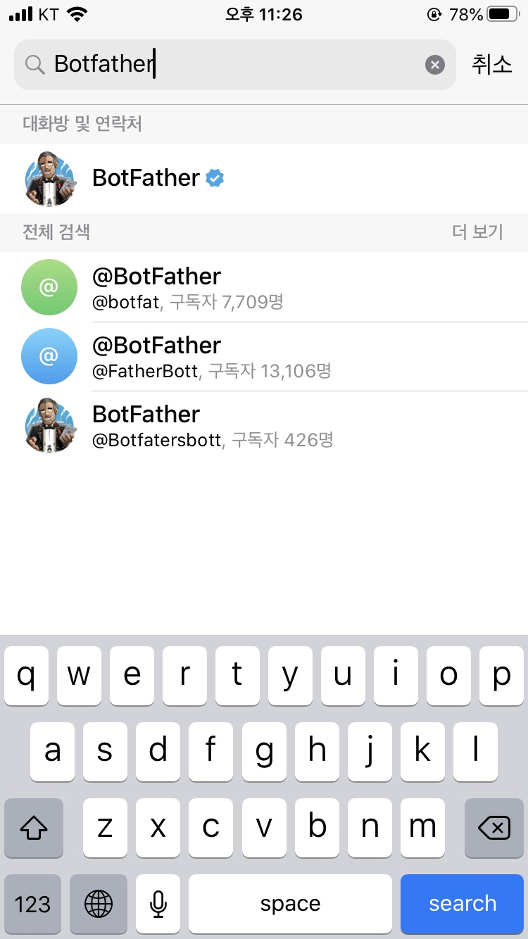 검색창에 'BotFather' 을 입력하여 검색합니다.