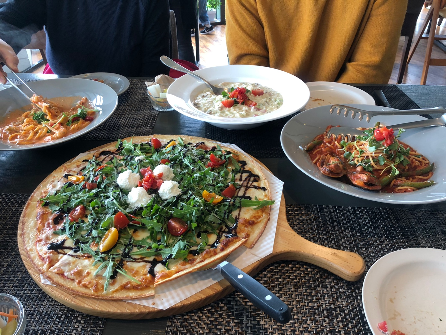 아라비아따 파스타 + 로제 쉬림프 파스타 + 루꼴라 피자 + 크림 리조또를 주문했습니다.