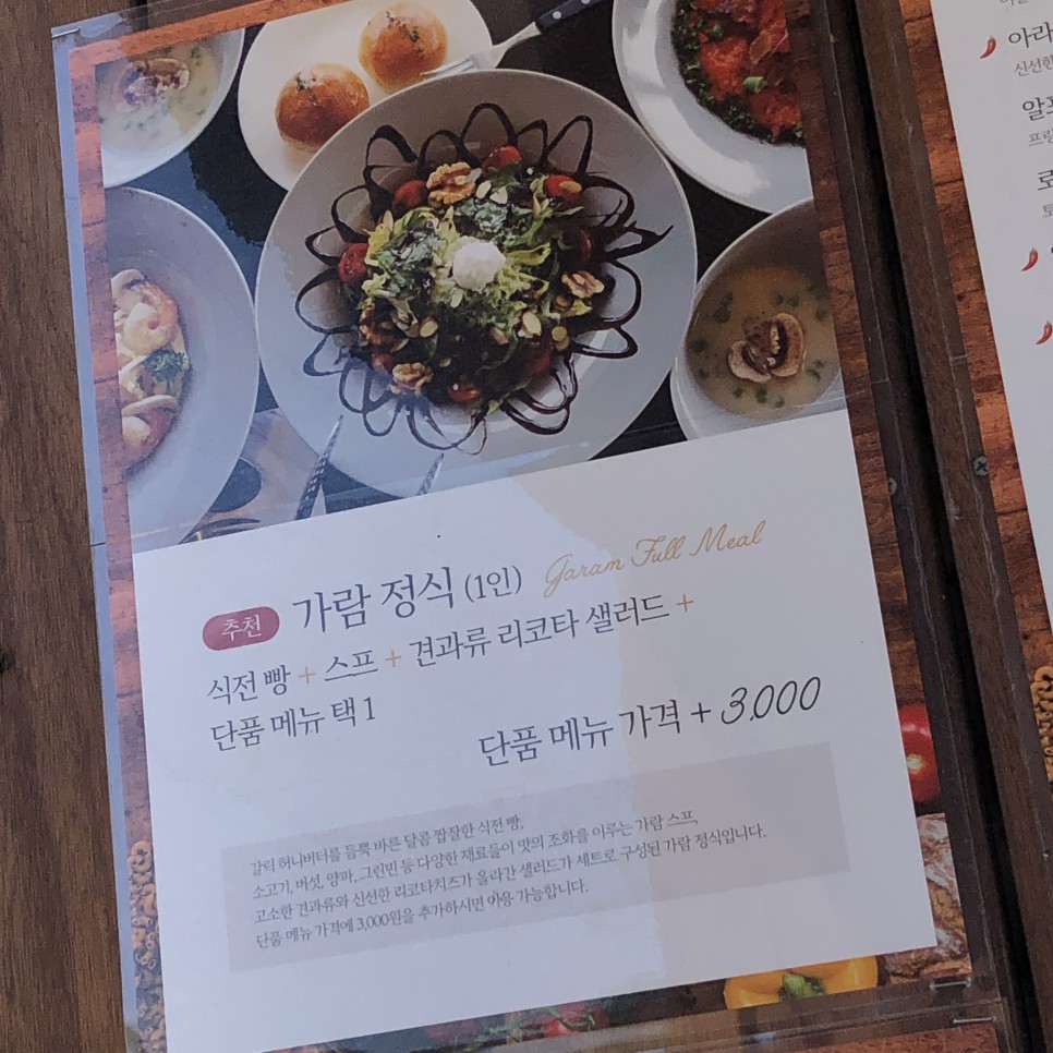 저희는 가람 정식 4인 추가해서, 식전 빵 + 가람 스프 + 견과류 리코타 샐러드를 이용했습니다.