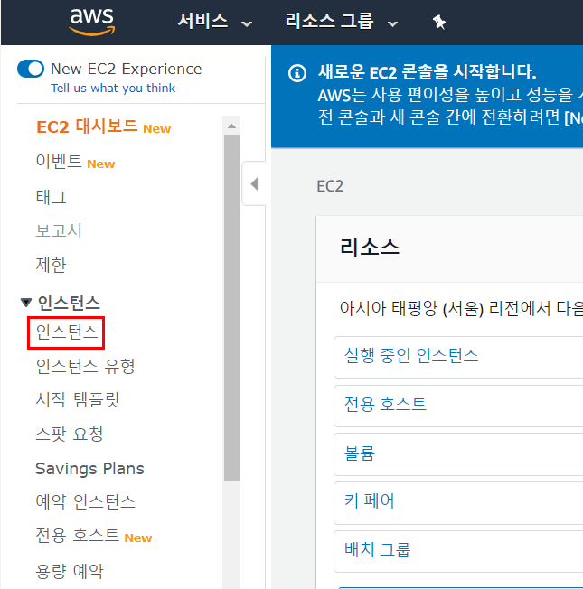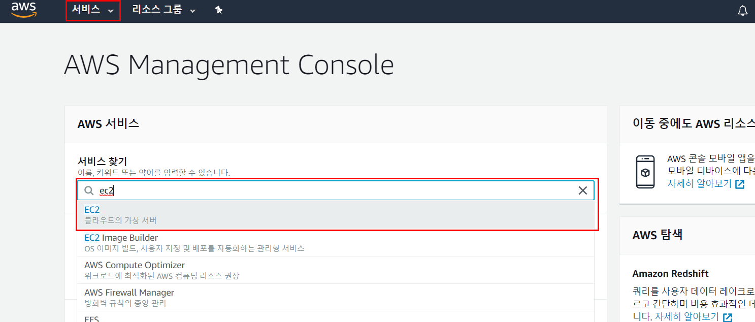 1. AWS 로그인 → 서비스 클릭 → EC2 선택