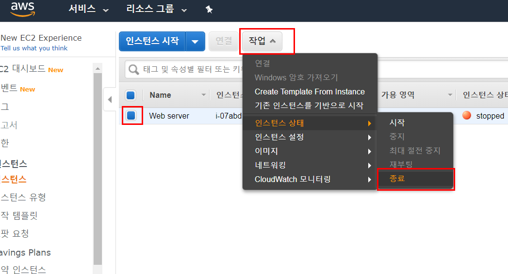 3. 삭제할 인스턴스를 체크 → 상단에 '작업' 클릭 → 인스턴스 상태 → 종료