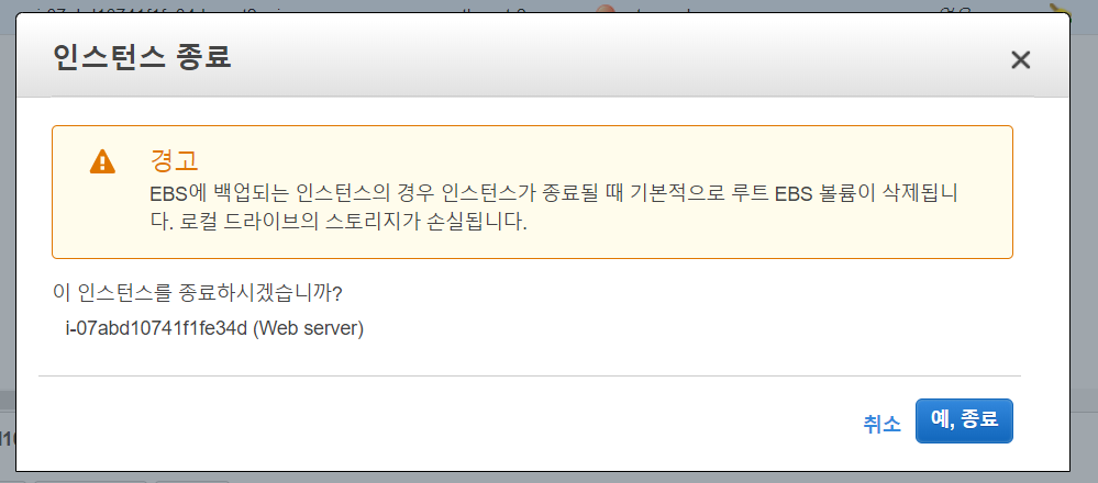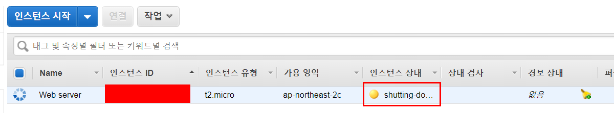 종료하면 인스턴스 상태가 노란색 버튼으로 'shuting-do' 상태로 변경됩니다.